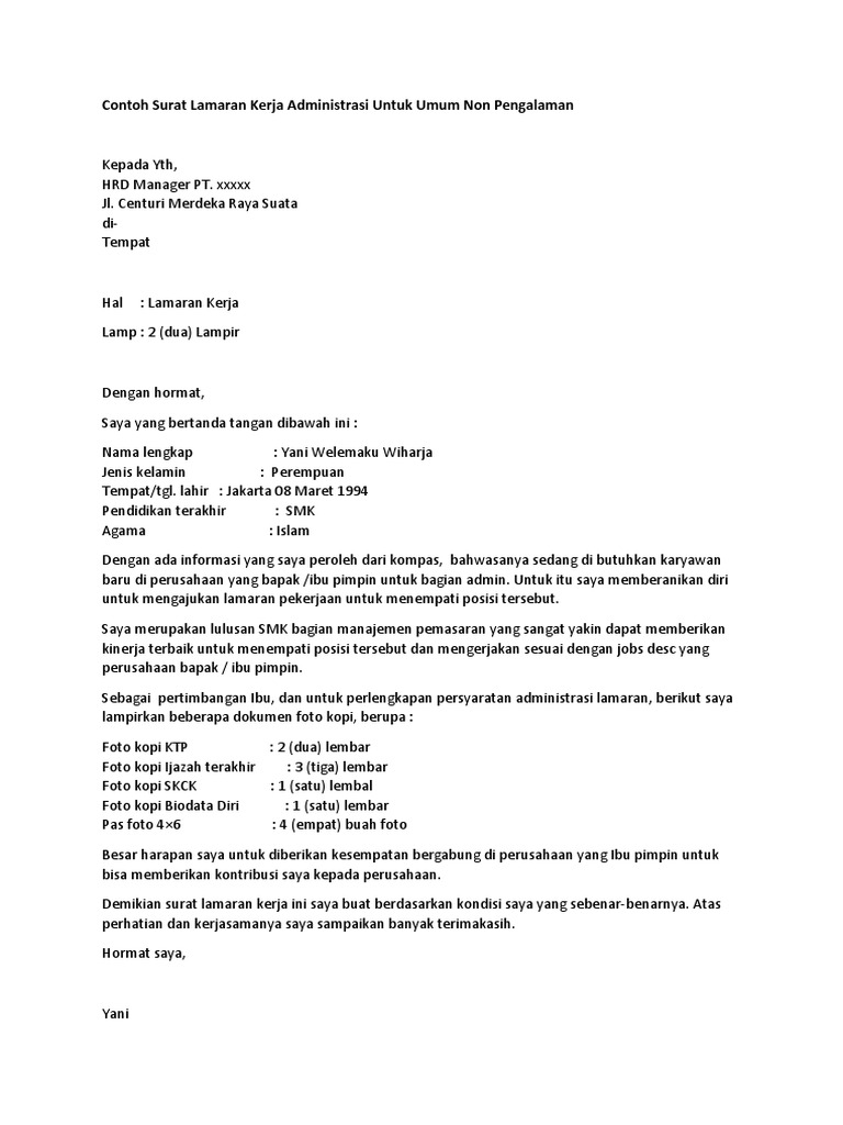 Meskipun pada hakikatnya hanya sebagai jalan rezeki dari tuhan. Contoh surat lamaran kerja dalam bahasa inggris dan artinya. Berbicara mengenai contoh surat lamaran kerja, tentu harus mengikuti prosedur dengan benar mengenai cara menulis surat lamaran kerja. Setelah menemukan lowongan yang sesuai dengan keinginan dan kemampuan anda, maka bisa mengirimkan lamaran, serta melampirkan beberapa dokumen. Banyaknya fresh garduate lulusan s1 berbagai jurusan setiap tahunnya surat lamaran kerja ialah surat yang ditulis/dibuat oleh seseorang dan ditujukan kepada suatu perusahaan/instansi dengan tujuan untuk melamar pekerjaan.