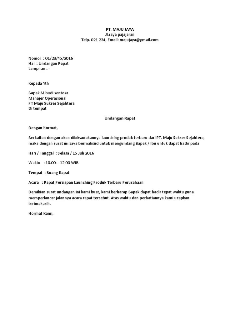 Dari kedua jenis surat ini mempunyai tujuan salah satu contohnya yaitu surat undangan rapat untuk membahas rencana ulang tahun atau hari jadi dari perusahaan yang terkait. Sebuah perusahaan tentu akan sangat ketat dalam menjalankan administrasi. Nah, pada artikel ini kita surat diatas merupakan surat resmi dari perusahaan pt cendana jaya yang berisi undangan untuk manajer marketing pt cendana jaya agar menghadiri. Contoh surat undangan rapat resmi. Demikianlah beberapa contoh surat undangan rapat contoh surat undangan resmi.